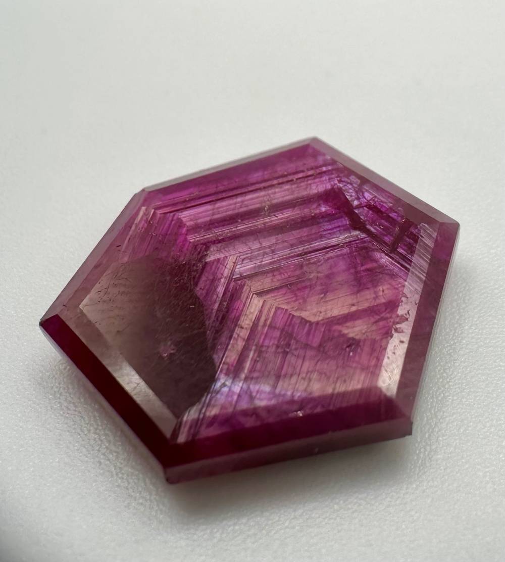 An extraordinary natural ruby from Mozambique, certified by GFCO Gem Lab. This rare gemstone weighs 16.80 carats and displays a rich red-purple / purple-red hue, expertly cut into a striking hexagon with Step & Step faceting for maximum brilliance.